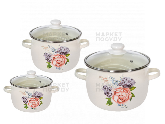 Набір каструль Idilia Півонія Amazing flowers молочна 3 пр сфер 1,5 л/2,5 л/3,5 л (6928)