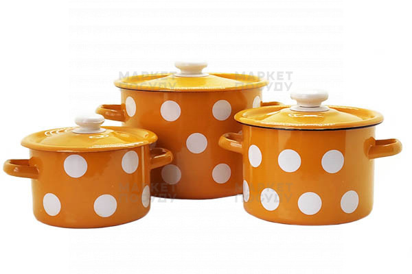 Набір емальований 842 складається з трьох циліндричних каструль різного об’єму. Він екологічний, довговічний та має стильний дизайн.