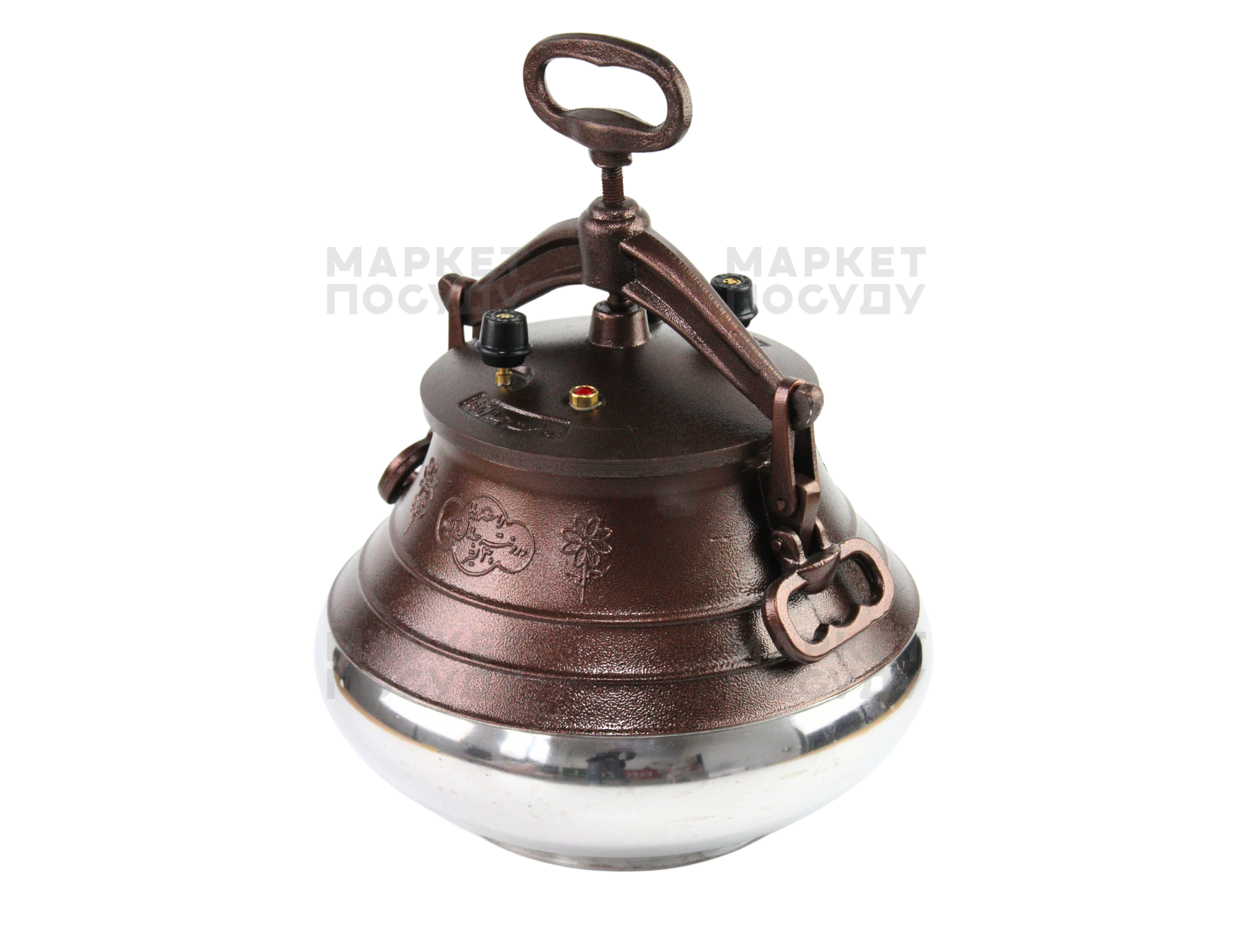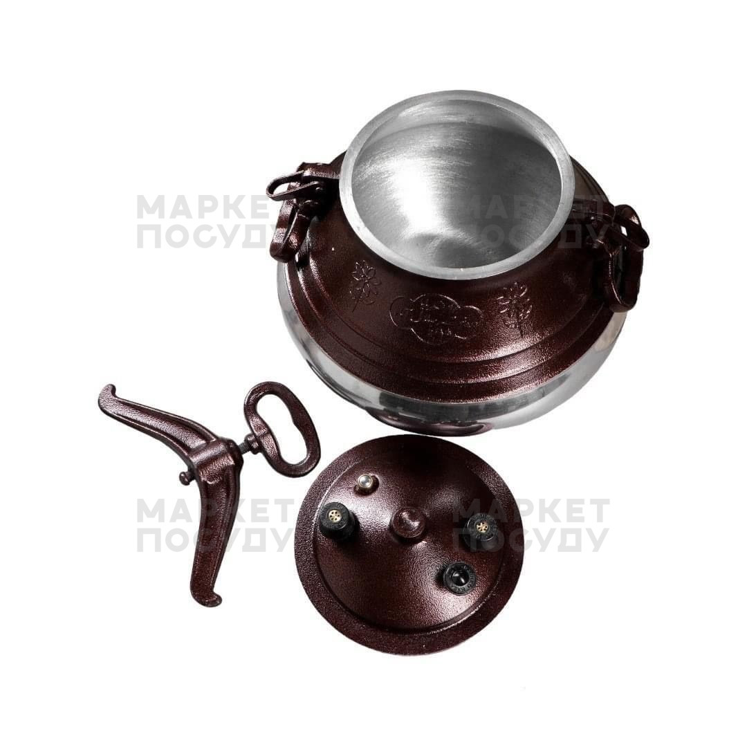 Виробник: RASHKO BABA LtdВага: 4 кг Фактичний об'єм: 6 л Товщина стінок: 11 мм Матеріал: Алюміній Висота: 345 мм Робочий тиск: 1.5 атм Робоча °t: 120 °C Діаметр низ: 152 мм Діаметр верх: 150-176 мм Діаметр центр: 255 мм