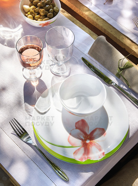 Набір розрахований на шість персон і включає повний комплект тарілок для різних страв: шість обідніх, шість глибоких супових та шість десертних, а також один місткий великий салатник. Матеріал від бренду Luminarc відрізняється підвищеною стійкістю до ударів та перепадів температур, що дозволяє сміливо використовувати посуд у мікрохвильовій печі та мити його в посудомийній машині. Скло не має пор, тому воно абсолютно гігієнічне, не вбирає запахи і не забарвлюється від продуктів, зберігаючи свій первісний вигляд та яскравість малюнка протягом багатьох років.
