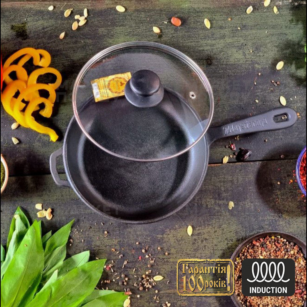 Залізо з вмістом вуглецю більше 2,14%. Якщо менше, то сталь. Залізо у чистому вигляді! У нашому випадку без будь-якого покриття (без емалі). Тому може іржавіти, якщо залишати мокрою! Важка! Не плутати зі старою бабусиною чавунною сковорідкою з литого алюмінію. Покриття на чавунному посуді утворюється в процесі прожарювання (якщо нова). А в процесі приготування воно постійно оновлюється. Але це не антипригарне покриття, як багато хто чомусь думають (бо чорне?), а найтонша полімерна плівка із запеченого масла (жиру), яка захищає вашу посудину від корозії, а також має гідрофобні властивості (відштовхує воду). І тому, щоб не прилипало, готувати потрібно з олією. Хіба що коржі можна без олії пекти. І так. На чавуні можна ПЕКТИ. Тому що він, крім усього іншого, має високу теплову емісію. Це є чи не головна перевага чавуну. Здатність віддавати тепло. Тепло від добре прогрітої сковороди ви відчуєте за півметра! Подібного ефекту вам від інших матеріалів не отримати. Теплова емісія у чавуну в 10 разів вища, ніж у алюмінію. Це означає, що продукт готується не тільки в місці торкання поверхні, а практично повністю. Пропікається. І якщо на алюмінієвій пательні млинці ви смажите, то на чавунній ви їх печете)