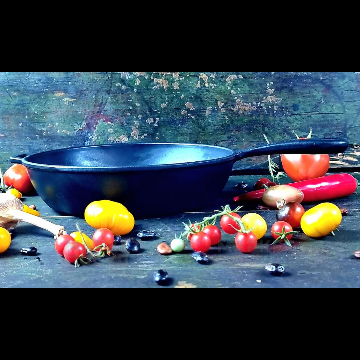 Ручка: залізна, що дозволяє використовувати сковороду на багатті або інших високотемпературних поверхнях.