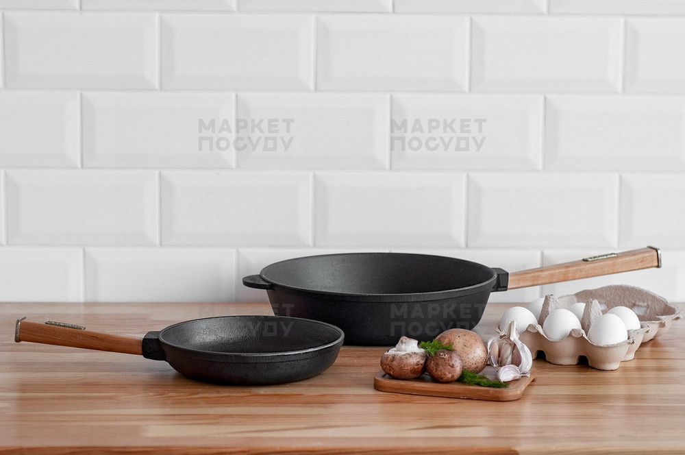 Велика чавунна сковорода для сім'ї. Висота стінок 60 мм робить сковороду універсальною як для смаження, так і гасіння.