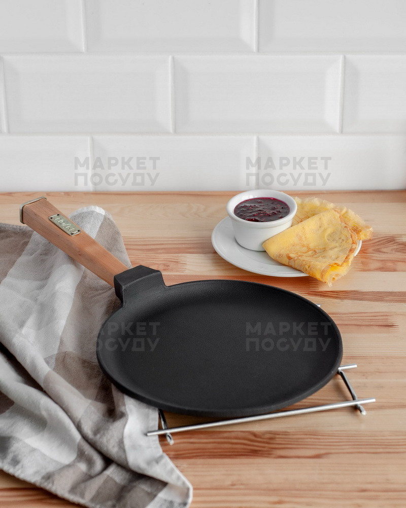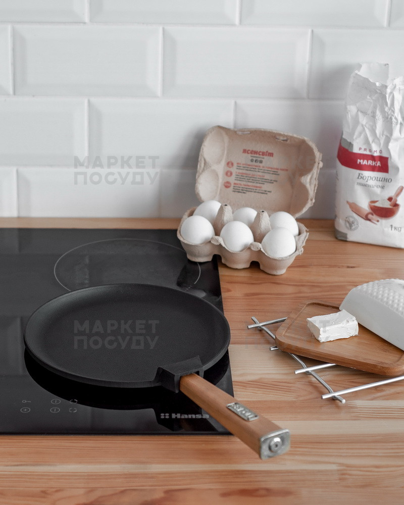 Ручка виготовлена з вільхи, має ергономічну форму і комфортно лежить у руці. Доступні моделі діаметром 220 та 240 мм. Завдяки низьким стінкам висотою 15 мм процес приготування млинців стає зручним та легким.