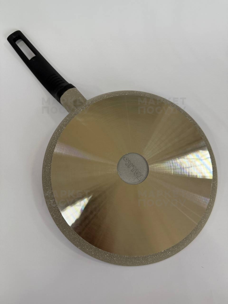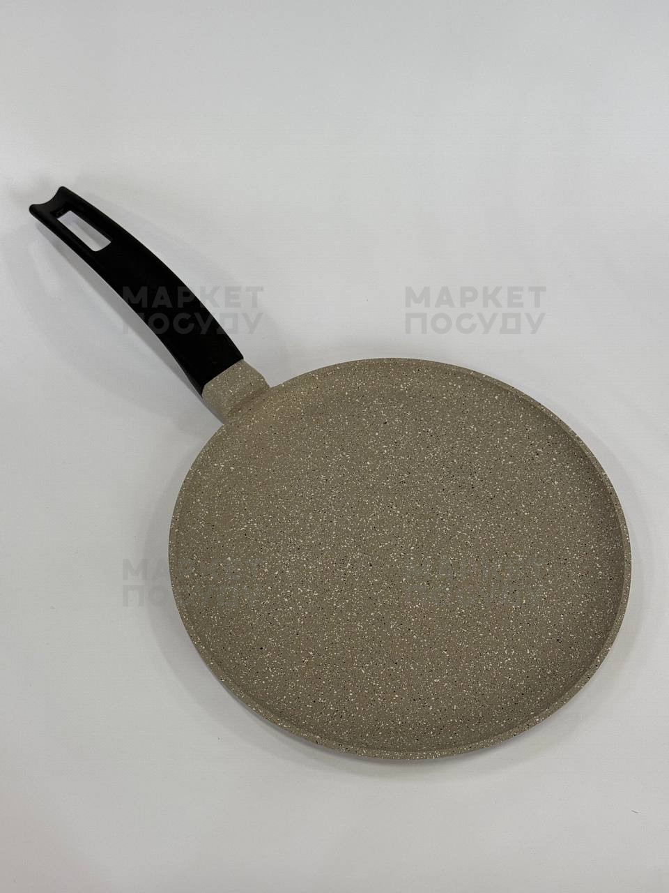 Сковорода млинцева без кришки з протипригарним покриттям світло-сірого гранітного кольору, виготовлена з алюмінієвого сплаву.
