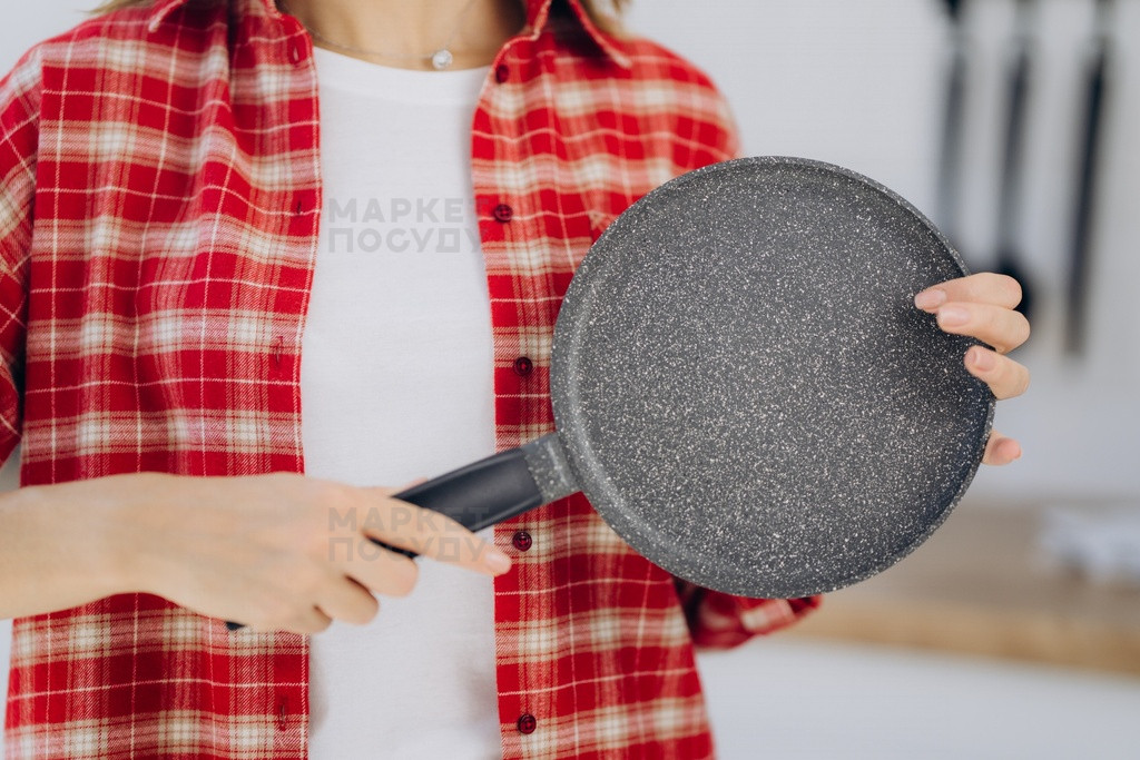 Сковорода млинцева без кришки з протипригарним покриттям світло-сірого гранітного кольору, виготовлена з алюмінієвого сплаву.