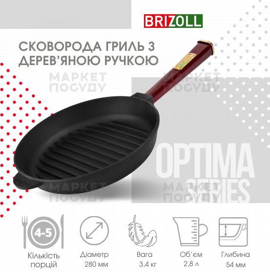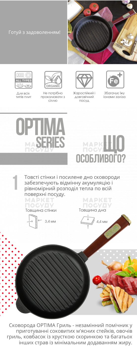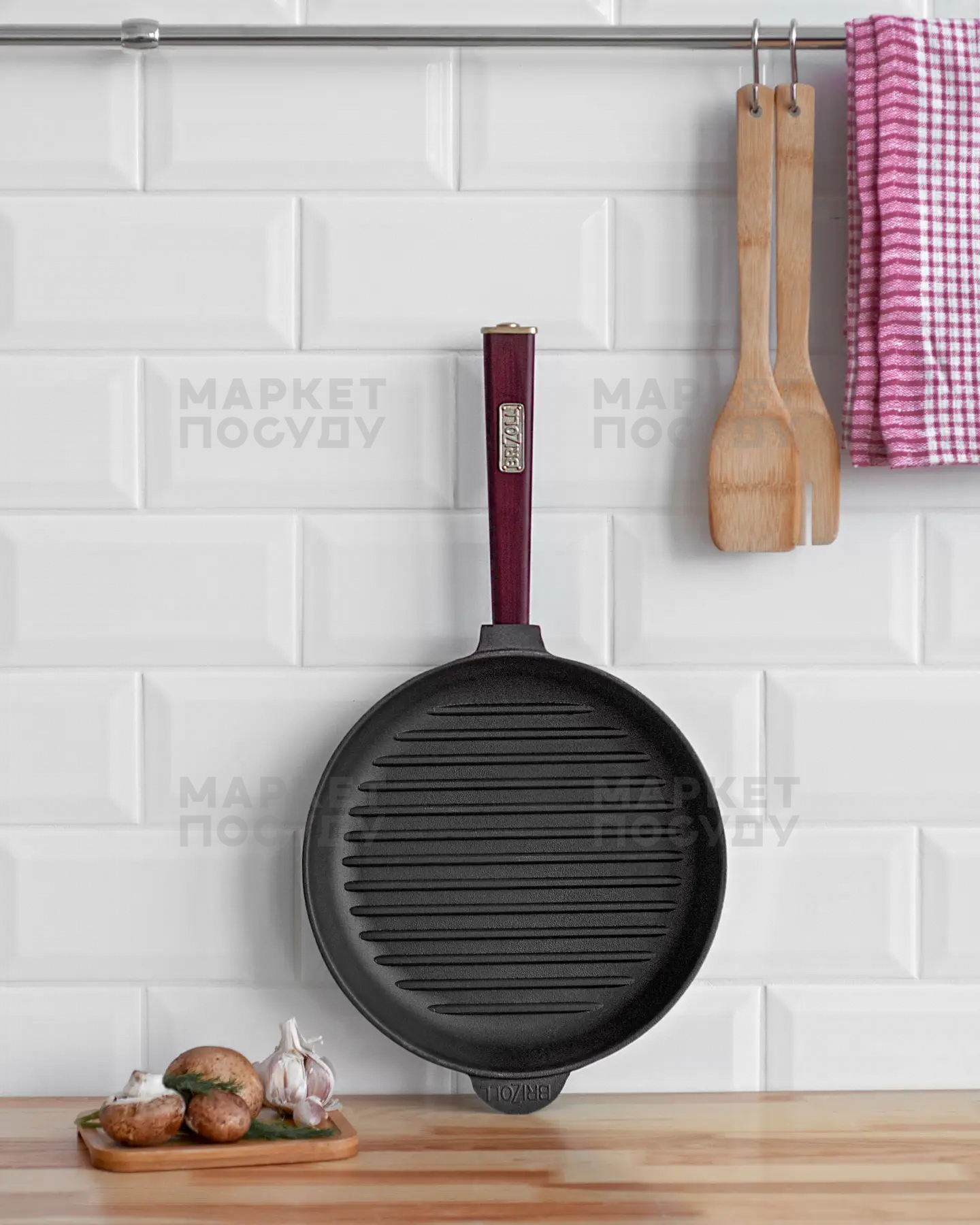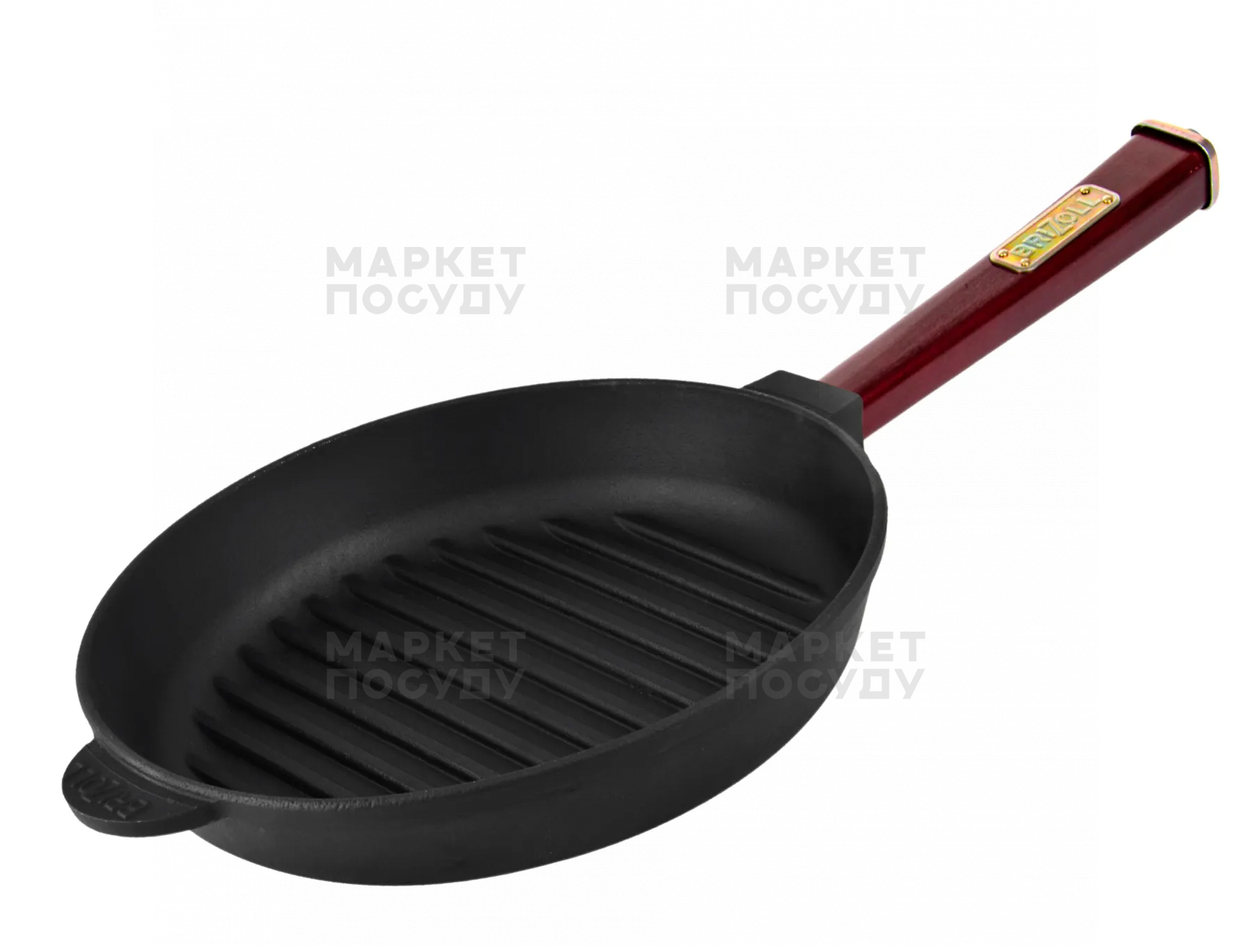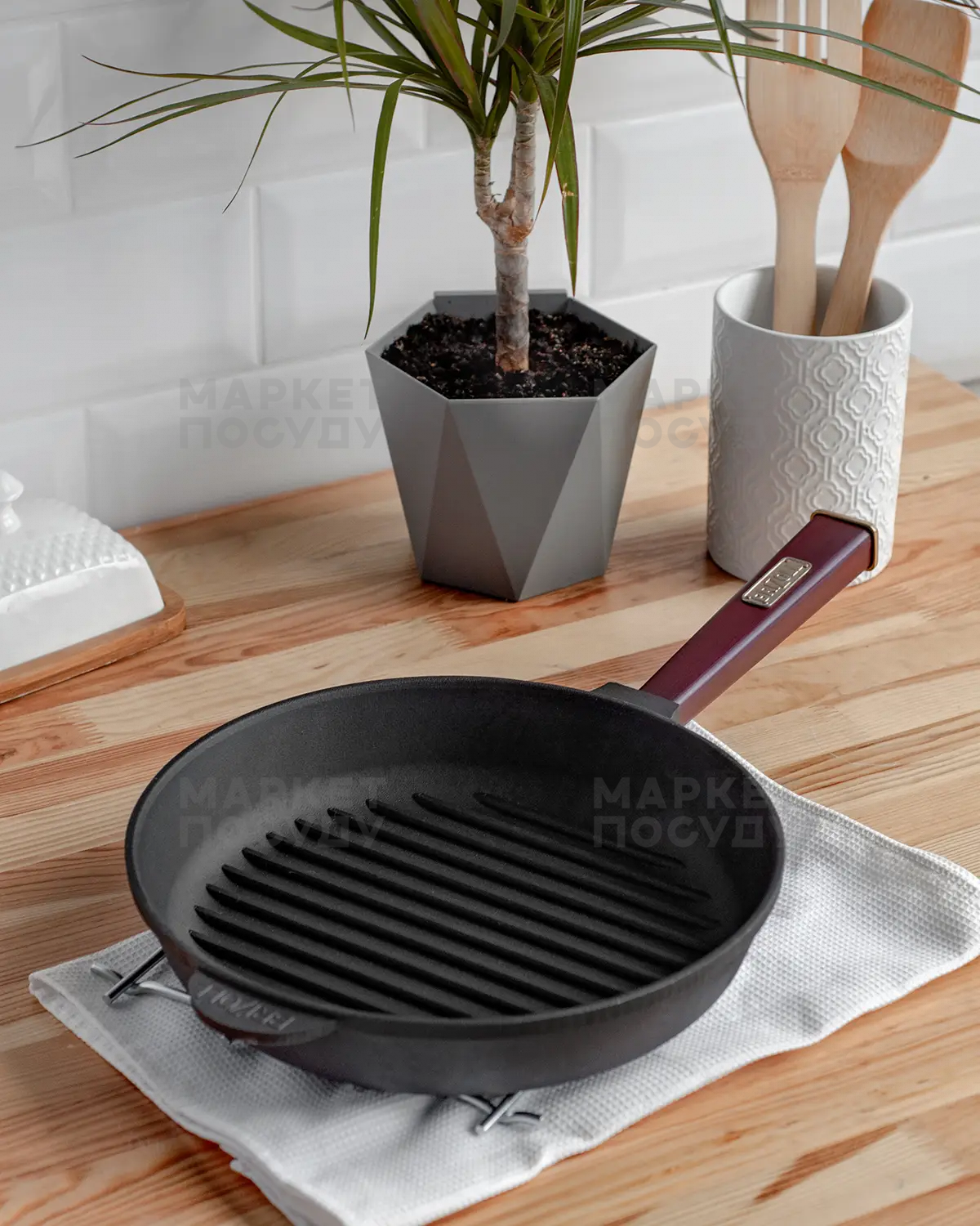 Представлена в асортименті сковорода гриль в оптимальних діаметрах 240-280 мм, Має зручну квадратну дерев’яну ручку, яка не нагрівається, надійно закріплена і добре лежить в руці