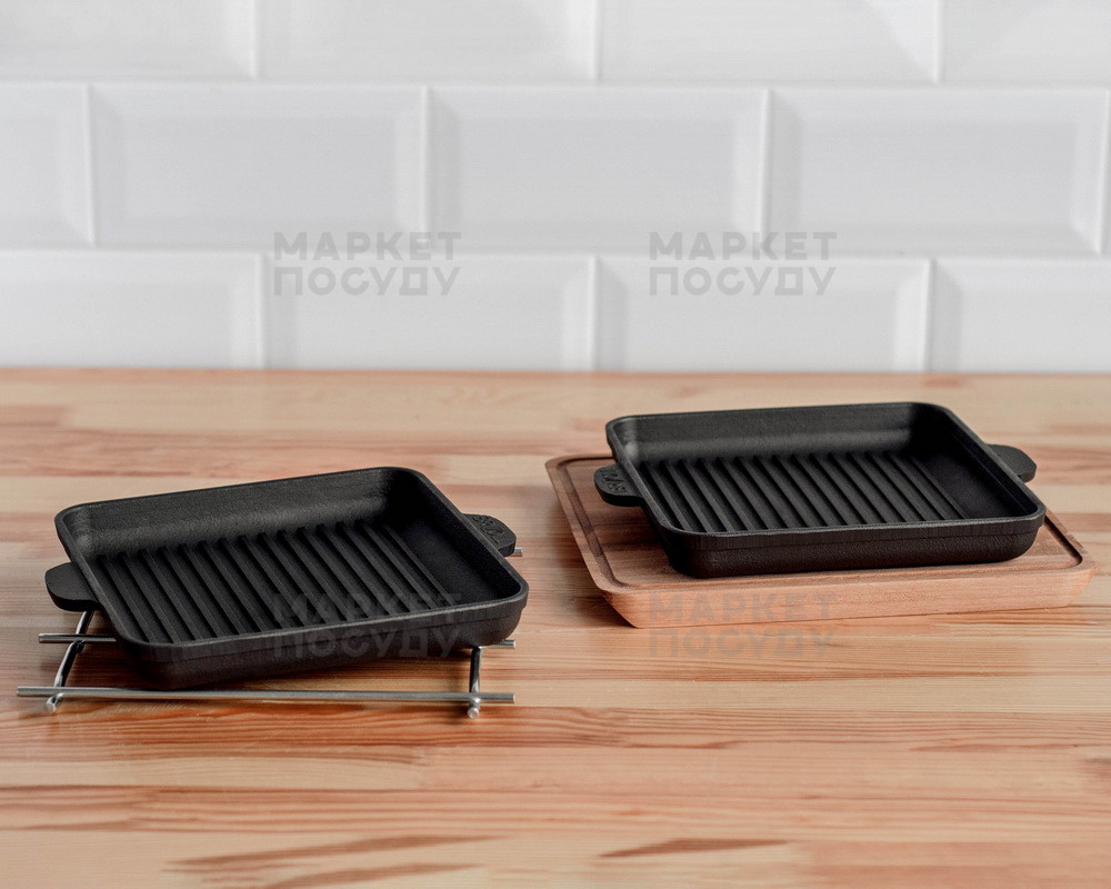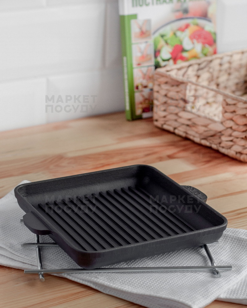 Квадратна порційна сковорідка-гриль відрізняється зручною формою та має більшу місткість порівняно з традиційною круглою. Виготовлена з якісного чавуну, вона стильно виглядає й чудово підходить для приготування різноманітних страв на грилі.