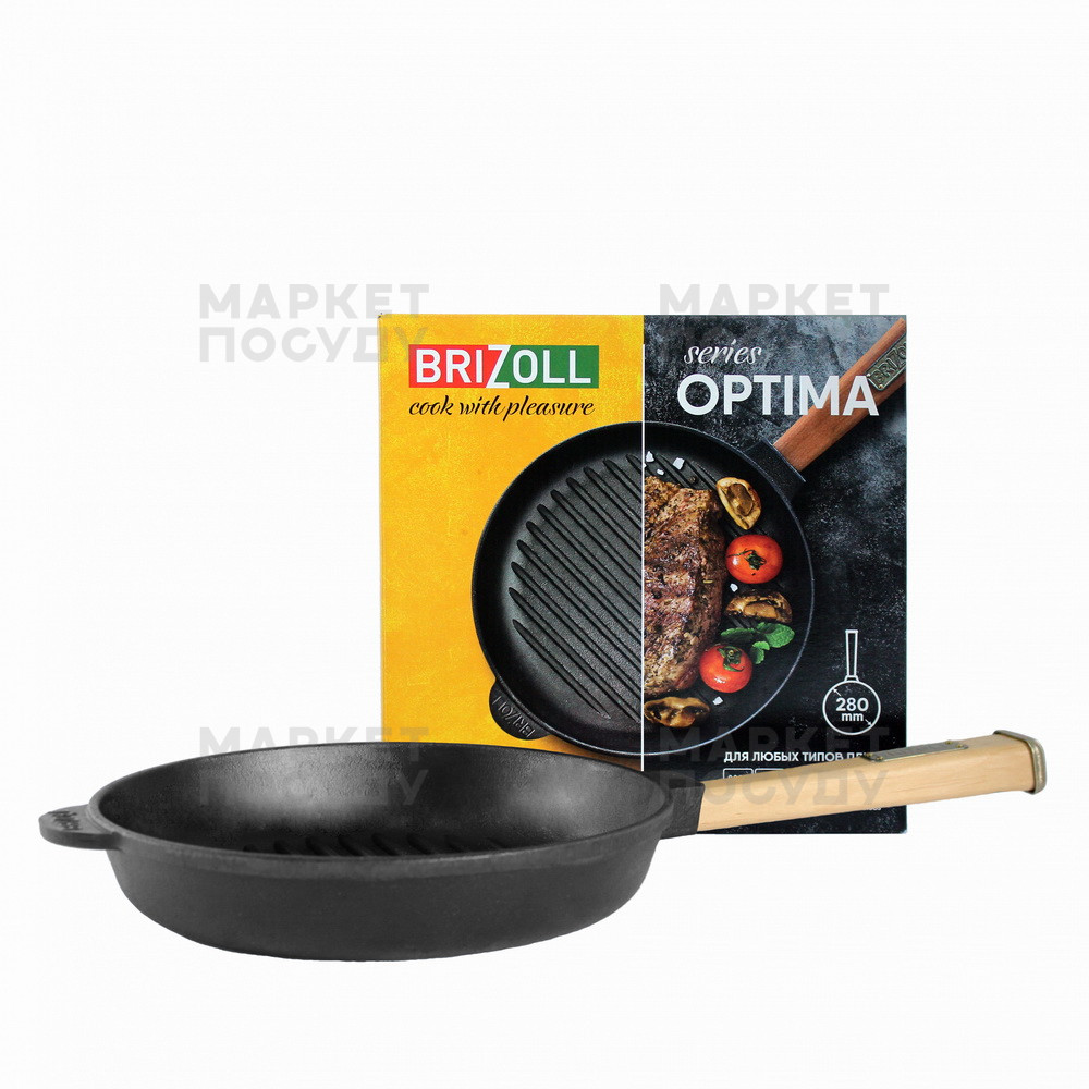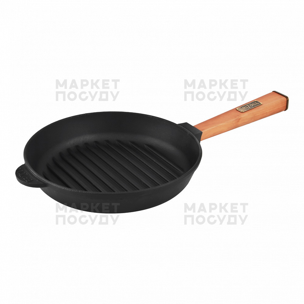Представлені в асортименті сковорода гриль в оптимальних діаметрах 240-280 мм. Має зручну квадратну дерев'яну ручку, яка не нагрівається, надійно закріплена і добре лежить у руці. <