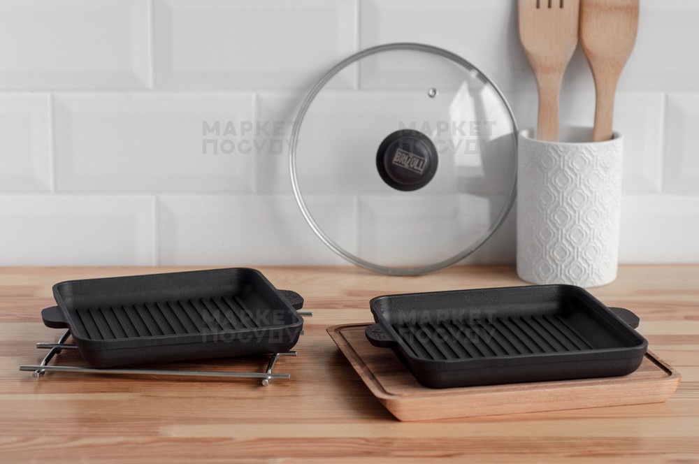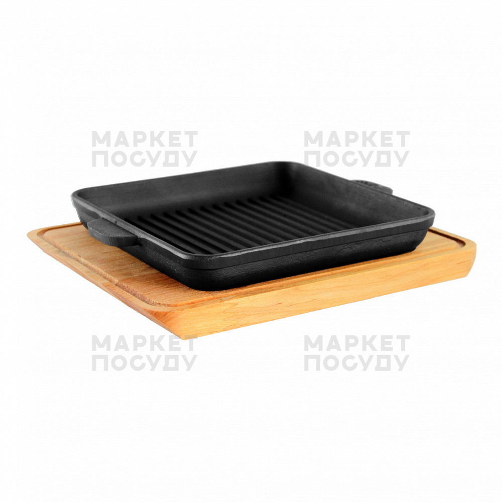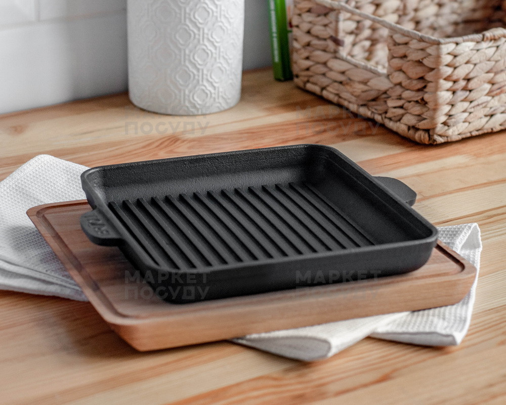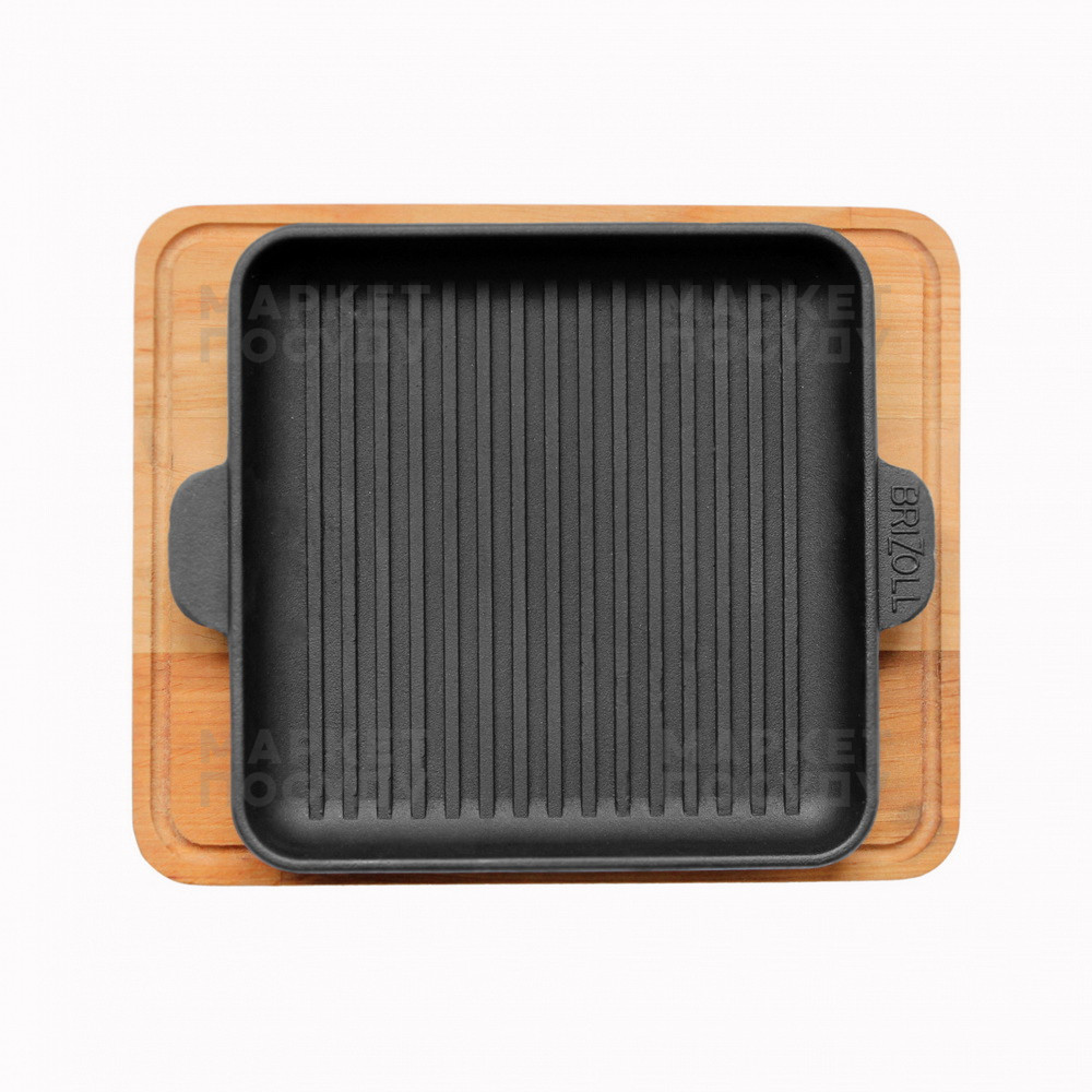 Чавунна порційна сковорідка-гриль на дерев'яній підставці чудово підійде для індивідуальної подачі страв, приготованих на грилі.