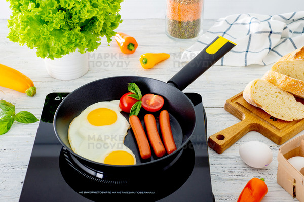 Виріб виготовлений з кованого алюмінію товщиною 3 мм, тому нагрівається швидко та максимально рівномірно. Це значно прискорює приготування їжі, а також перешкоджає пригорянню й нерівномірному просмажуванню продуктів.