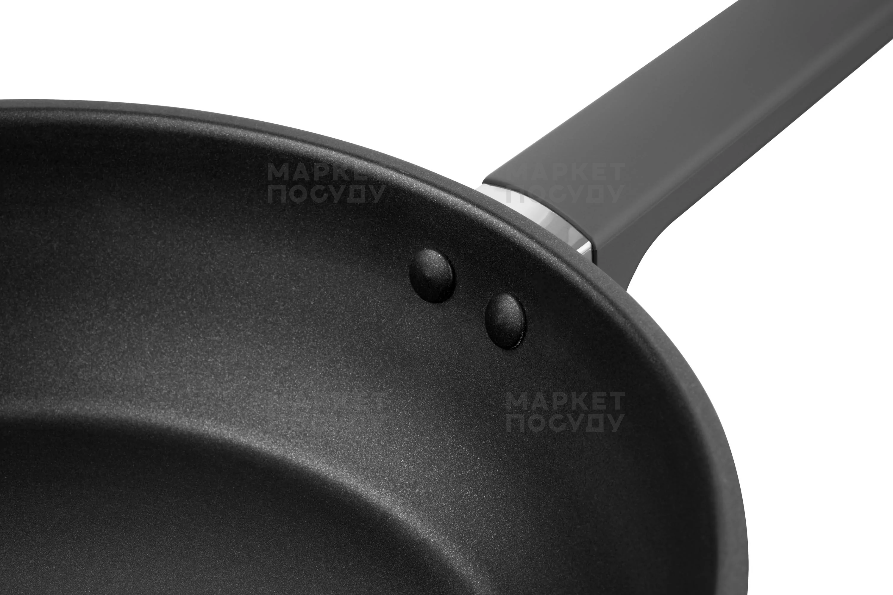 Товщина стін та дна дещо відрізняється - 0,6 та 3 мм відповідно. Ергономічна бакелітова рукоятка має soft-touch-покриття, а внутрішня поверхня виробу - протипригарна (Xylan Plus).
