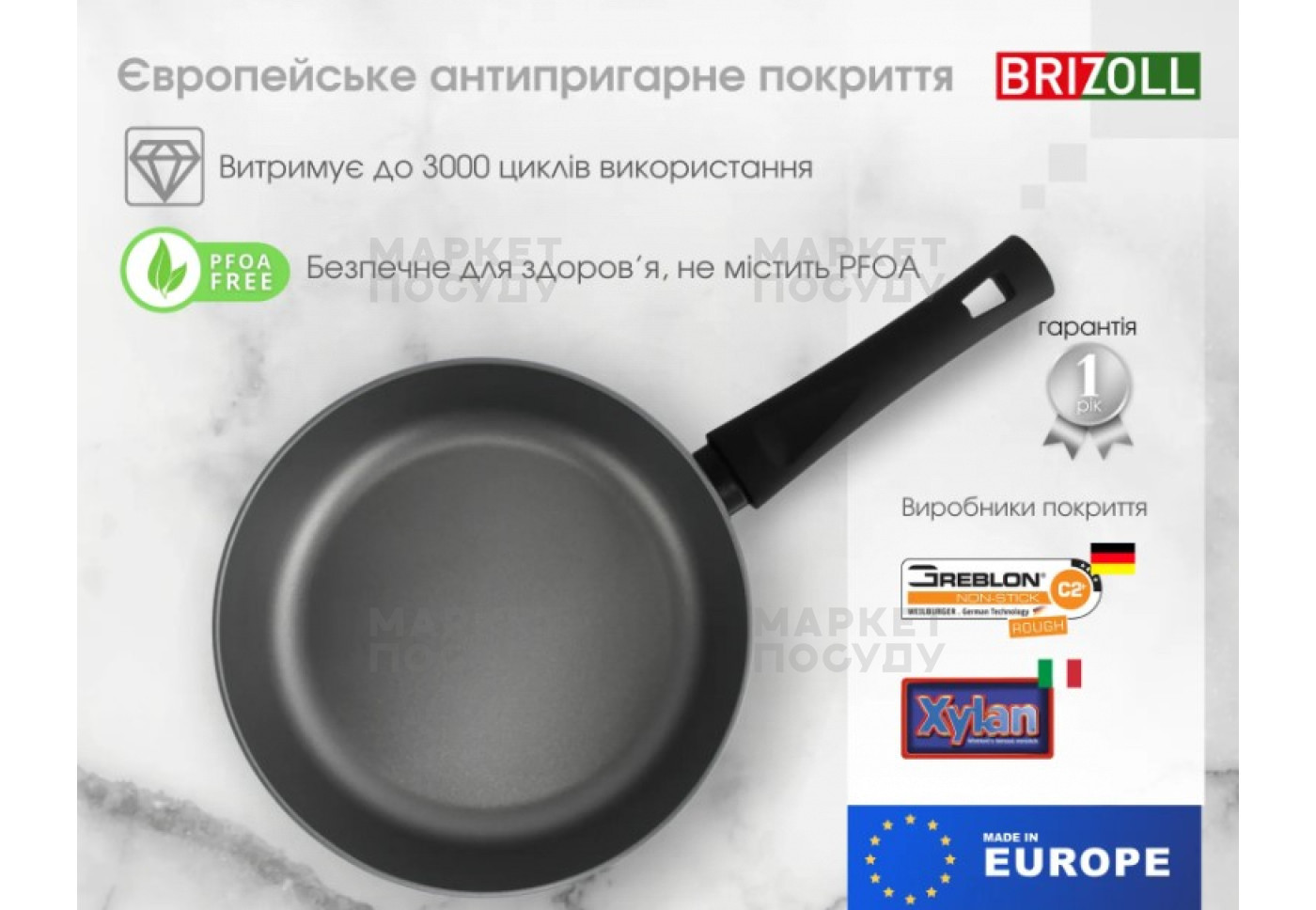 Алюмінієві сковороди Brizoll оснащені високоякісним європейським полімерним антипригарним покриттям. Ця інноваційна технологія гарантує, що продукти під час приготування не пригорятимуть. Ви зможете готувати страви з мінімальним додаванням олії. Це антипригарне покриття є абсолютно безпечним, екологічно чистим і довговічним, що забезпечує на 40-50% більш тривалу експлуатацію сковороди.
