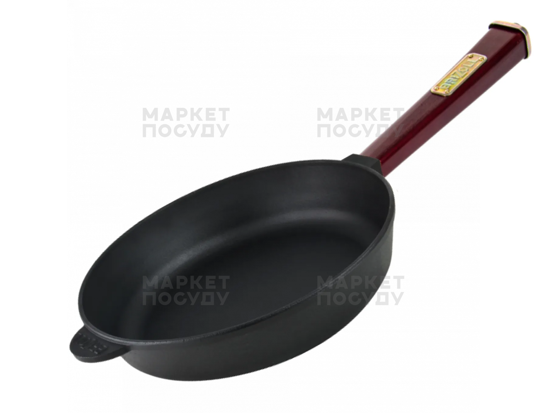 Сковорода виконана з литого чавуну, має товсті стінки і дно, сприяє рівномірному готуванню страв без пригорання. Стійка до пошкоджень і дозволяє використання металевих лопаток.