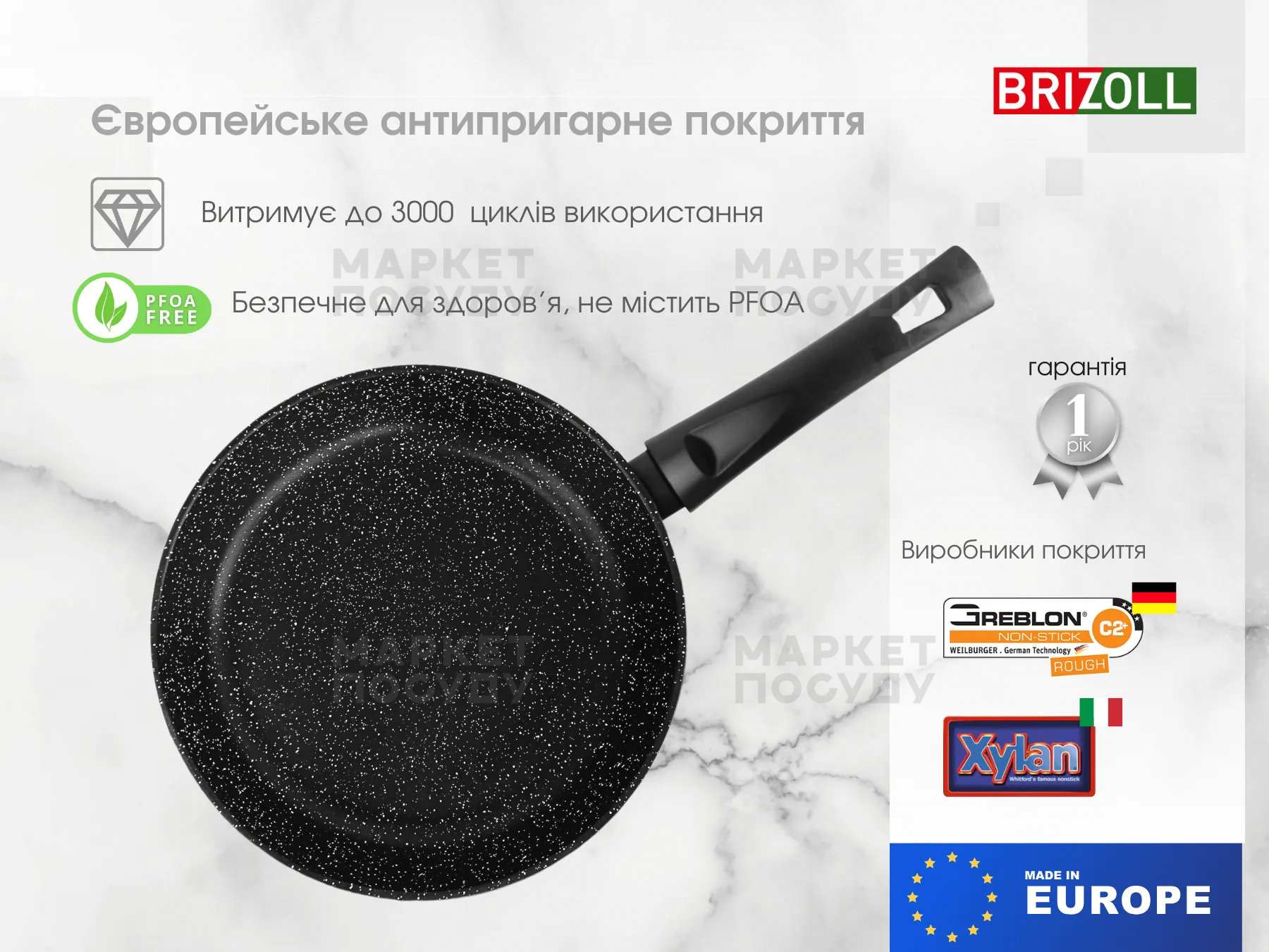 Алюмінієві сковороди BRIZOLL оснащені високоякісним європейським полімерним антипригарним покриттям. Ця інноваційна технологія гарантує, що продукти під час приготування не пригорятимуть. Ви зможете готувати страви з мінімальним додаванням олії, завдяки чому вони будуть більш здоровими. Крім того, це антипригарне покриття абсолютно безпечне, екологічно чисте та довговічне, що забезпечує на 40-50% більш тривалу експлуатацію сковороди. Антипригарне покриття відповідає європейським та українським стандартам безпеки для матеріалів, які контактують з харчовими продуктами.