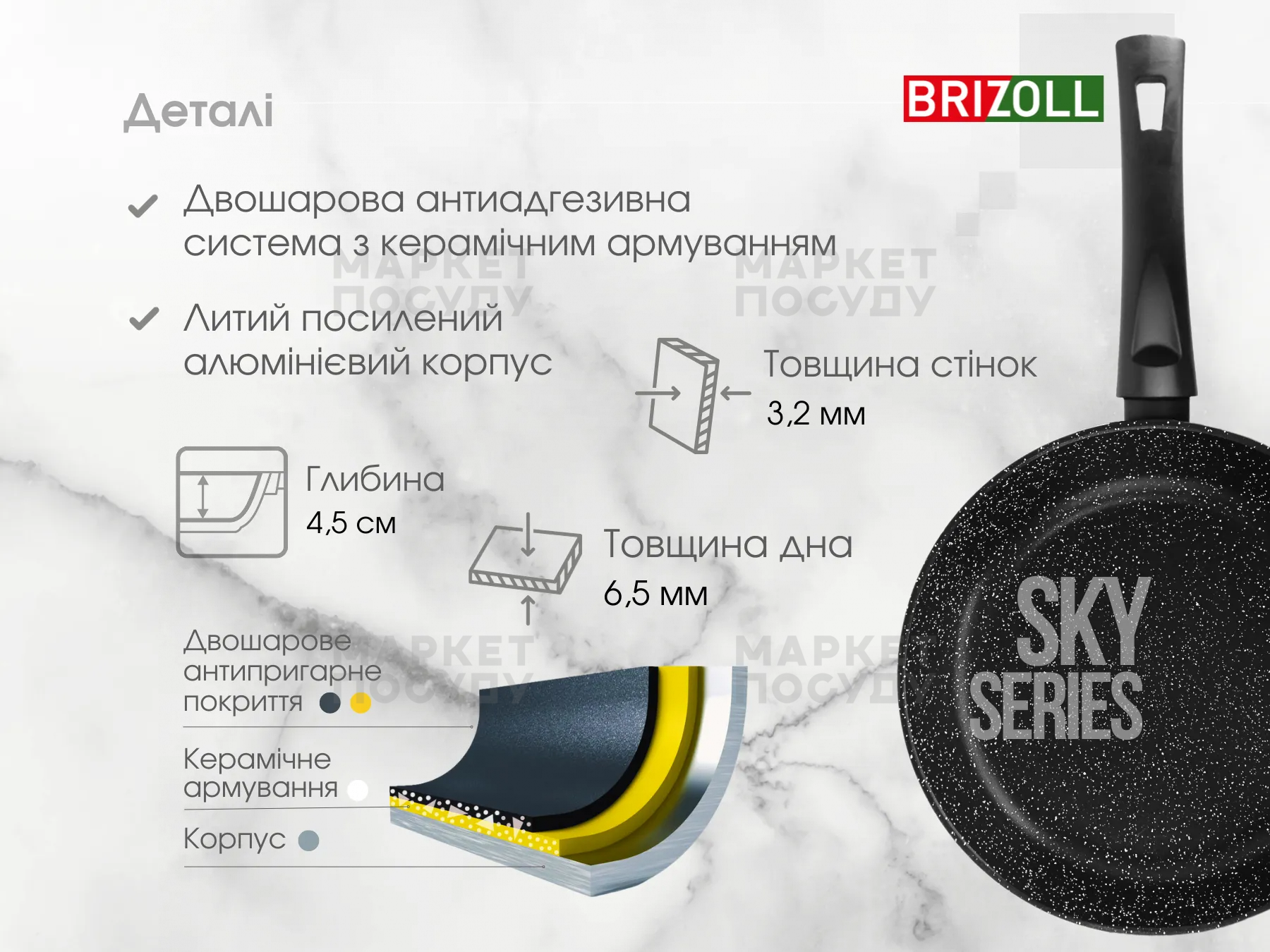 BRIZOLL - це литий посуд українського виробництва, що відтепер включає лінійку високоякісних сковород алюмінієвої конструкції з антипригарним покриттям - SKY SERIES. Цей посуд стане незамінним помічником на вашій кухні і дозволить вам готувати страви з легкістю та задоволенням.