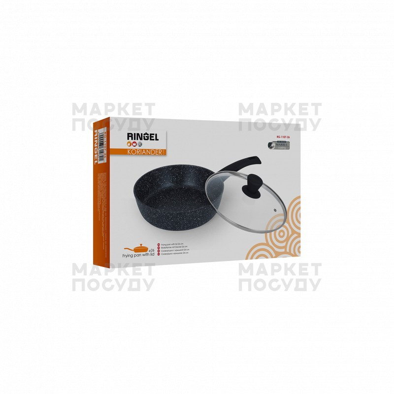 Універсальна сковорода Ringel утілить ваші сміливі кулінарні ідеї. Антипригарне покриття Marble Coating зносостійке навіть за умови регулярного використання. Виріб стійкий до появи мікротріщин і подряпин. Спеціальний сталевий індукційний диск на дні сковороди дає можливість використовувати її на всіх видах плит, зокрема індукційних, інфрачервоних та склокерамічних. У комплекті Koriander є кришка з термостійкого скла.