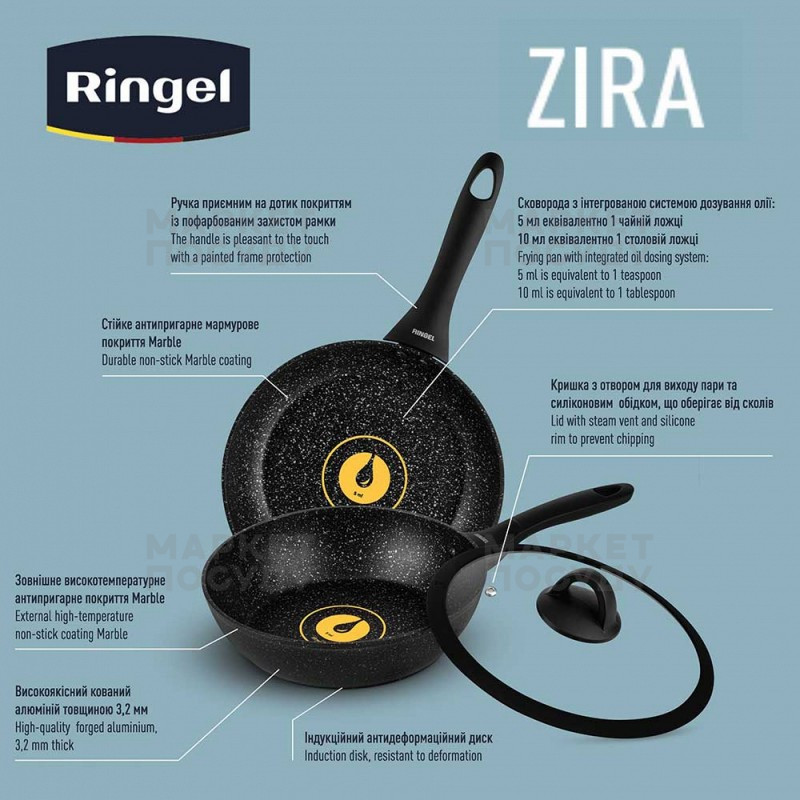 Сковорода Ringel Zira - універсальний гаджет для приготування та розігріву найрізноманітнішої їжі. Виготовлена із потовщеного високоякісного алюмінію, 3.2 мм. Ця сковорода є міцним посудом зі швидким та рівномірним нагріванням. Багатошарове антипригарне покриття забезпечить можливість готувати страви з використанням мінімальної кількості олії.