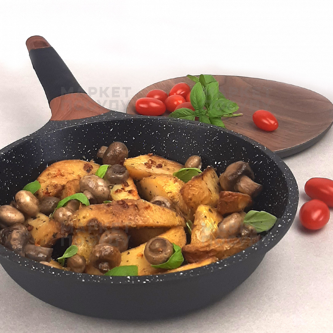 Містка сковорода — незамінний предмет на будь-якій кухні, який дозволяє приготувати сніданок або вечерю для всієї родини. Сковорода універсальна і підходить для всіх плит, до того ж її можна мити в посудомийній машині. Корпус сковороди – литий алюміній із полімерним антипригарним покриттям Greblon С3 із трьох шарів. Покриття має високий рівень твердості і стійко до подряпин і інших пошкоджень. Ручка з бакеліту ергономічна і зручна у використанні. Під час приготування їжі не ковзає і не нагрівається.