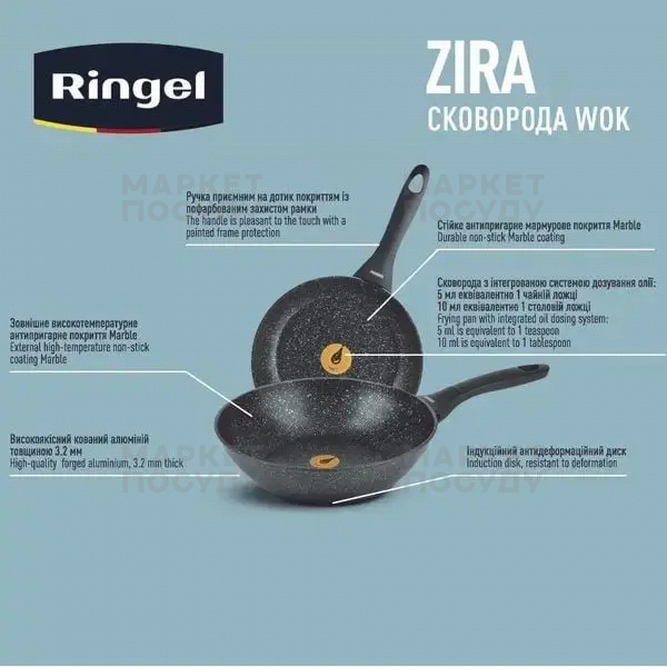 У кожну сковороду Ringel інтегровано першу у світі систему дозування олії. Найменше розподіл системи відповідає 5 мл олії, а більше - 10 мл олії. За допомогою цієї системи ви зможете легко та швидко приготувати одночасно здорові та смачні страви з використанням мінімуму жиру та з максимальним збереженням корисних речовин у страві.