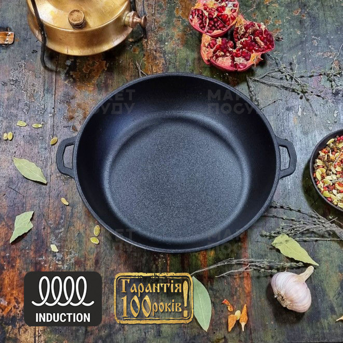 ✅ Рівномірне нагрівання: Чавун добре акумулює тепло та довго його утримує, що дозволяє стравам готуватися рівномірно.