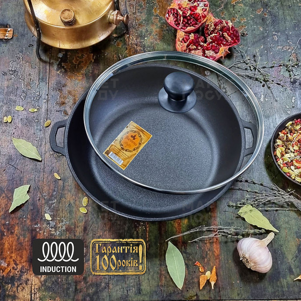 Жаровня 28*6см лита чавунна зі скляною кришкою Maysternya (T104СЗ)